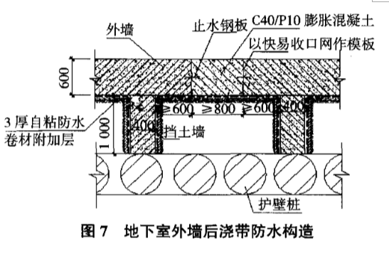 因地下室每施工完成一層并做好防水后,需對外墻進(jìn)行回填,而地下室側(cè)墻后澆帶則需在兩側(cè)混凝土結(jié)構(gòu)澆筑60 d后補(bǔ)澆C35/P10膨脹混凝土,所以施工時(shí),在外墻后澆帶外大于600 mm處澆筑400 mm厚混凝土擋土墻,使400 mm厚擋土墻正對護(hù)壁樁,擋土墻配筋10@200,水平筋一端錨人地下室外墻,另一端植筋植入護(hù)壁樁中?;靥钔燎皯?yīng)先將擋土墻外側(cè)防水施工完成,待外墻后澆帶混凝土澆筑后再施工擋土墻內(nèi)側(cè)防水。具體施工,見圖7。