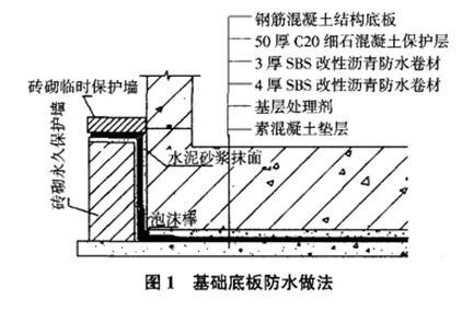 本項目地下防水設(shè)防等級為I級,采用鋼筋混凝土結(jié)構(gòu)自防水和柔性防水卷材相結(jié)合的防水設(shè)計[1】。地下基礎(chǔ)底板柔性防水層采用“3 mm+4 mm”雙層SBS改性瀝青防水卷材的防水設(shè)計,見圖1。地下室立墻、車庫頂板柔性防水層采用3 mm厚SBS改性瀝青防水卷材和4 mm厚復(fù)合銅胎基耐根穿刺防水卷材的防水設(shè)計。